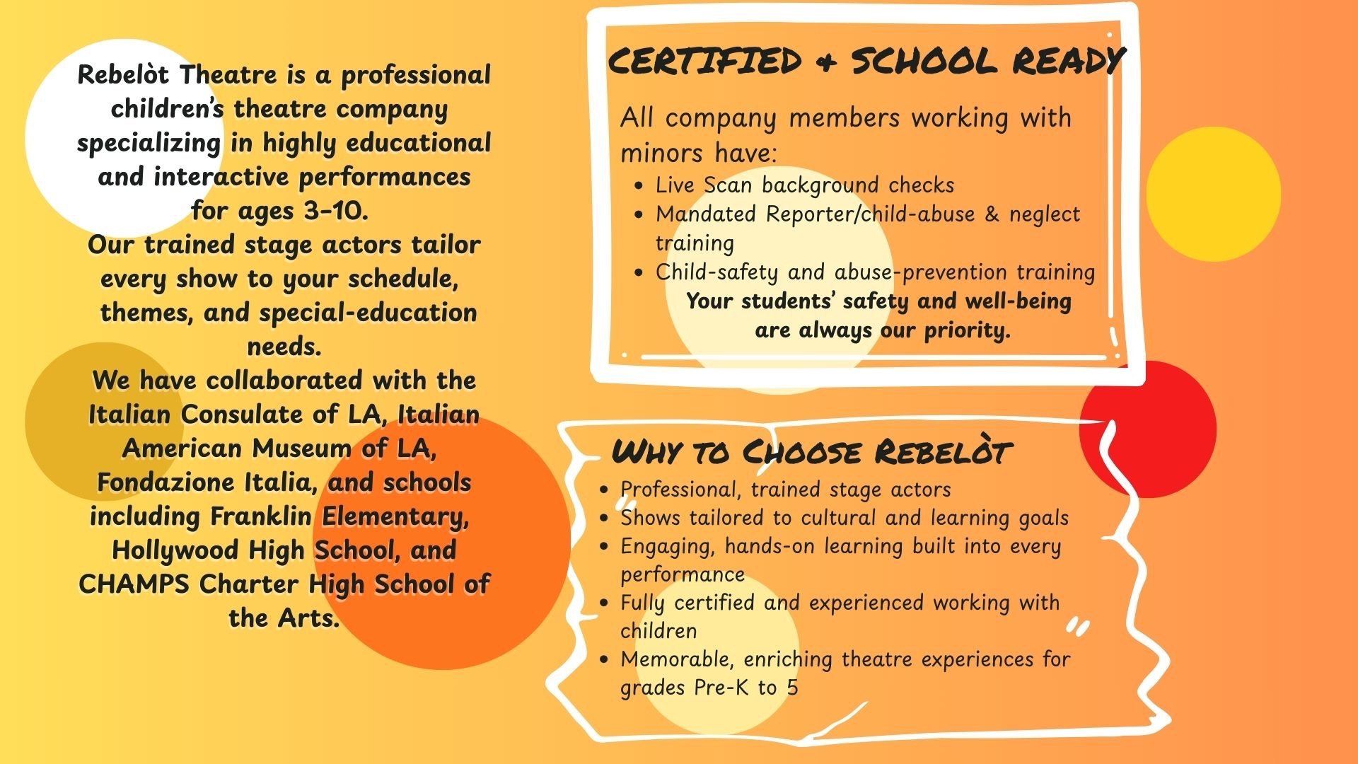 If you’re looking for a reliable, engaging, and adaptable arts program that meets educational standards while exciting students, Rebelòt Theatre provides a practical and memorable solution for elementary schools.