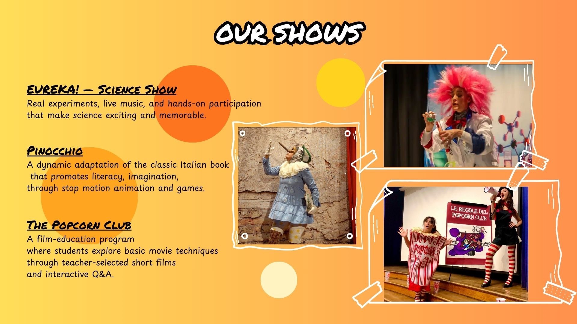 Our team is led by an experienced theatre professional with over 20 years of performance and educational programming experience, ensuring shows are age-appropriate, structured, and easy to integrate into the school day. Performances are turnkey, require minimal setup, and can be scheduled as assemblies, enrichment activities, or cultural arts events.