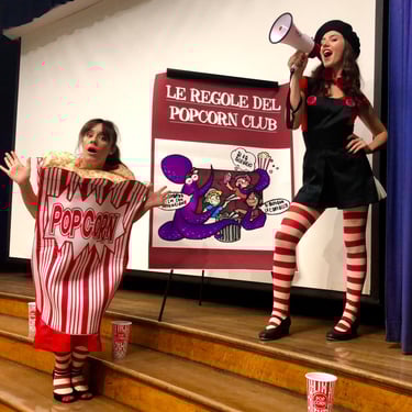 Interactive show with the projection of a movie. Live characters. Popcorn! English language or Italian Language. 90 minutes long. Age 5 to 12.